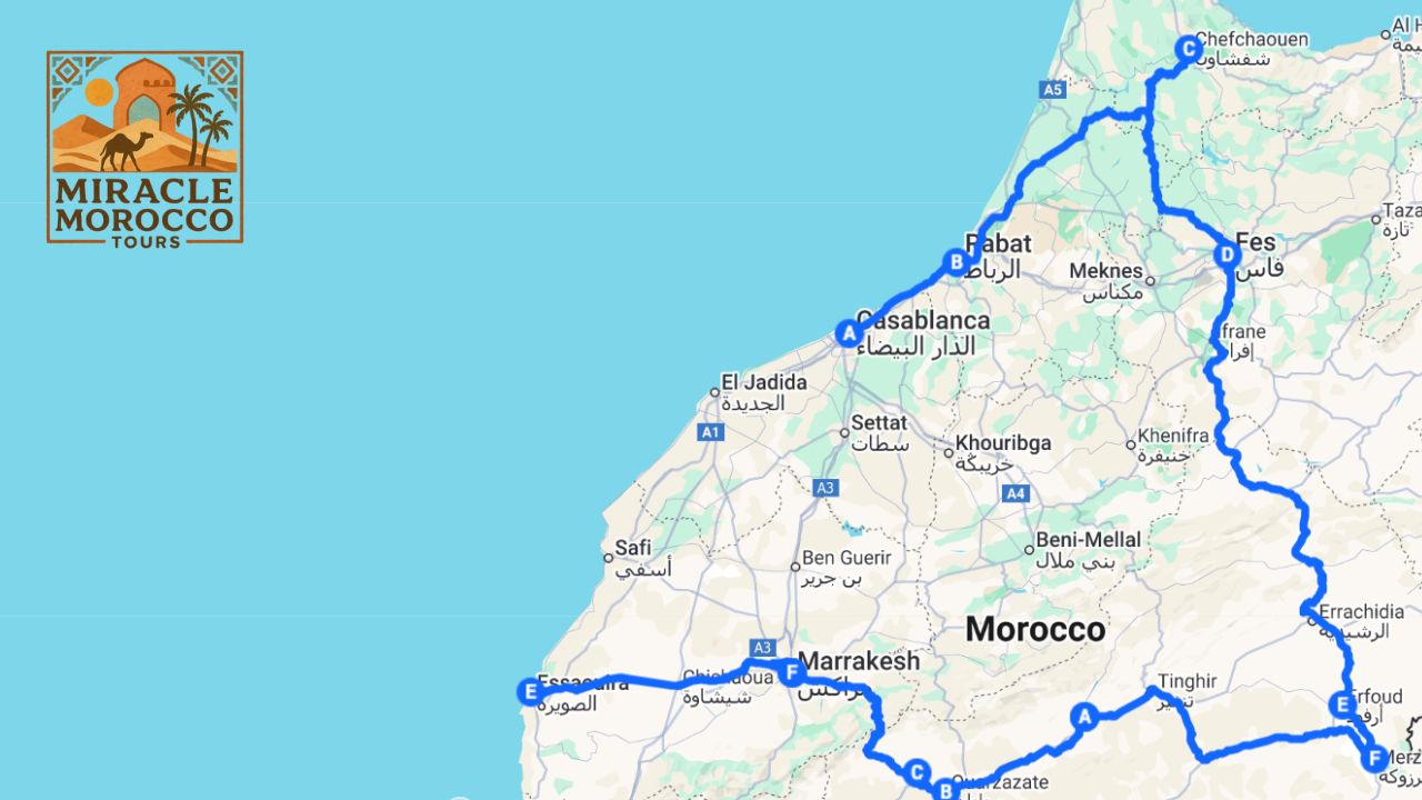 This 15 Days Morocco Grand Tour from Casablanca offers the ultimate exploration of Morocco’s diverse landscapes, rich culture, and imperial heritage. Starting in Casablanca, travel north to the blue-washed city of Chefchaouen, then to the imperial cities of Fes and Meknes, the Roman ruins of Volubilis, and the majestic Atlas Mountains.