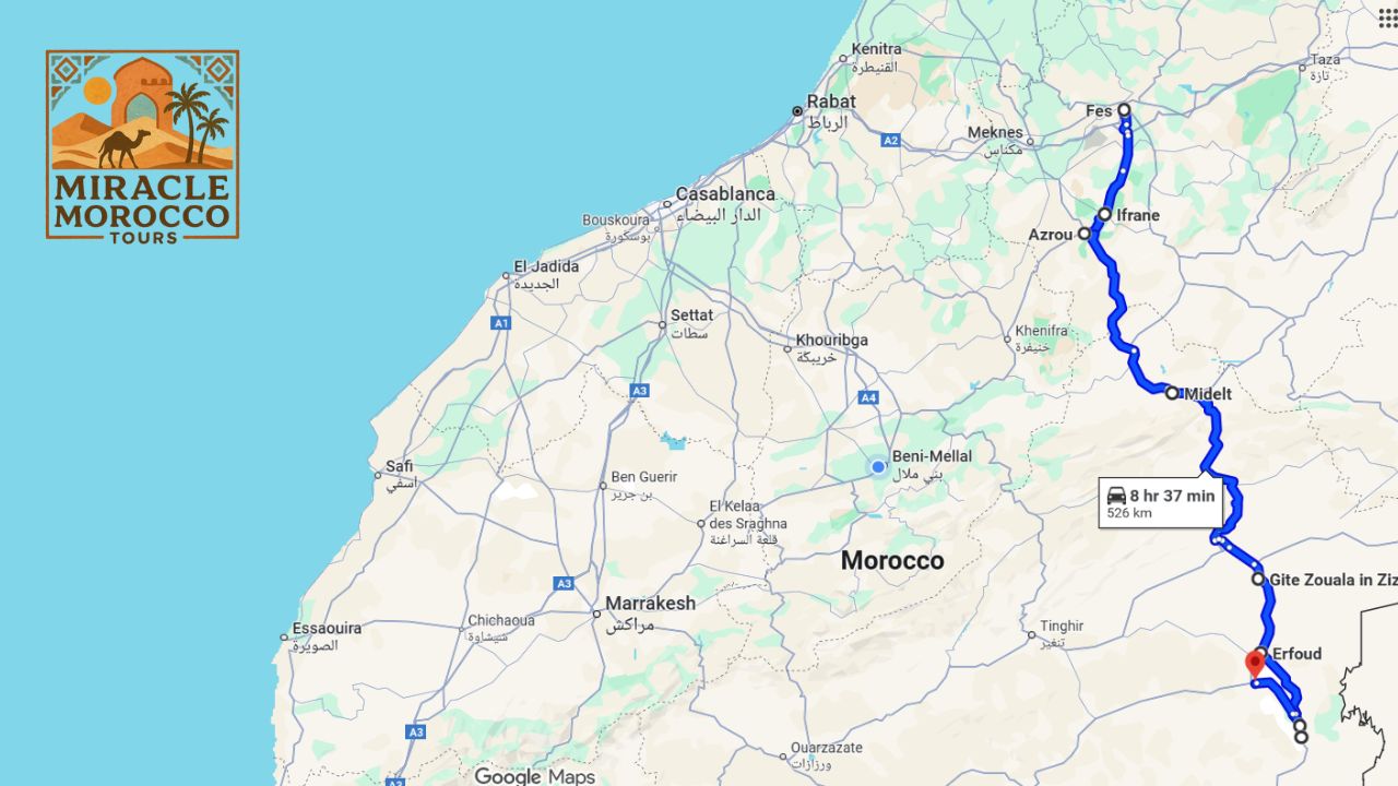 3-Day Fes to Merzouga Camel Trek Morocco Desert Tour Map: