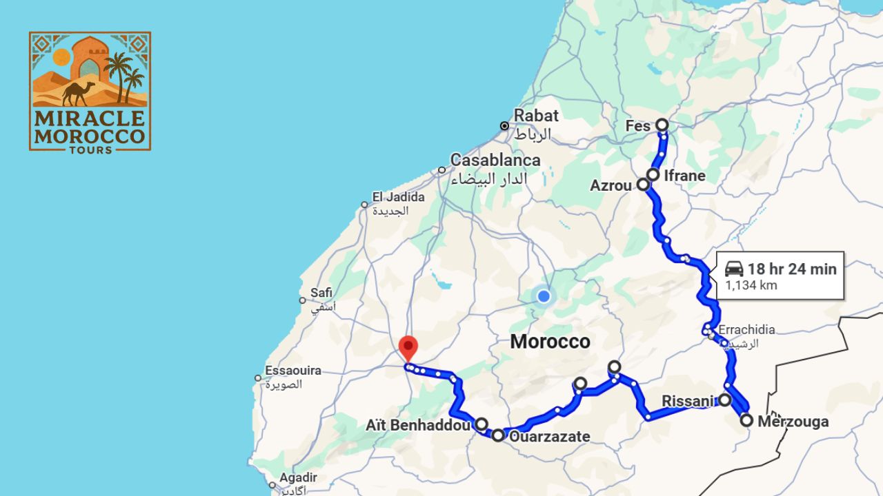 This 6 Days Tour from Fes to Marrakech is one of the most beautiful journeys across Morocco. It takes you through the country’s rich history, stunning landscapes, and authentic Berber culture. Begin your adventure in Fes Morocco’s spiritual capital before traveling through cedar forests, mountain passes, and the breathtaking Ziz Valley.